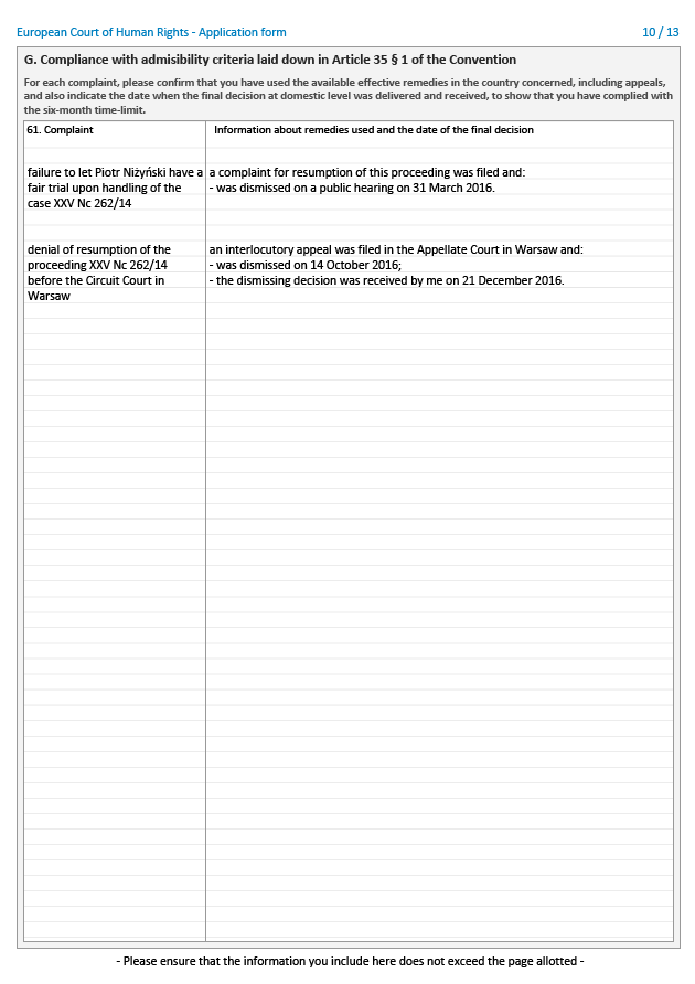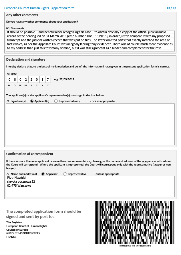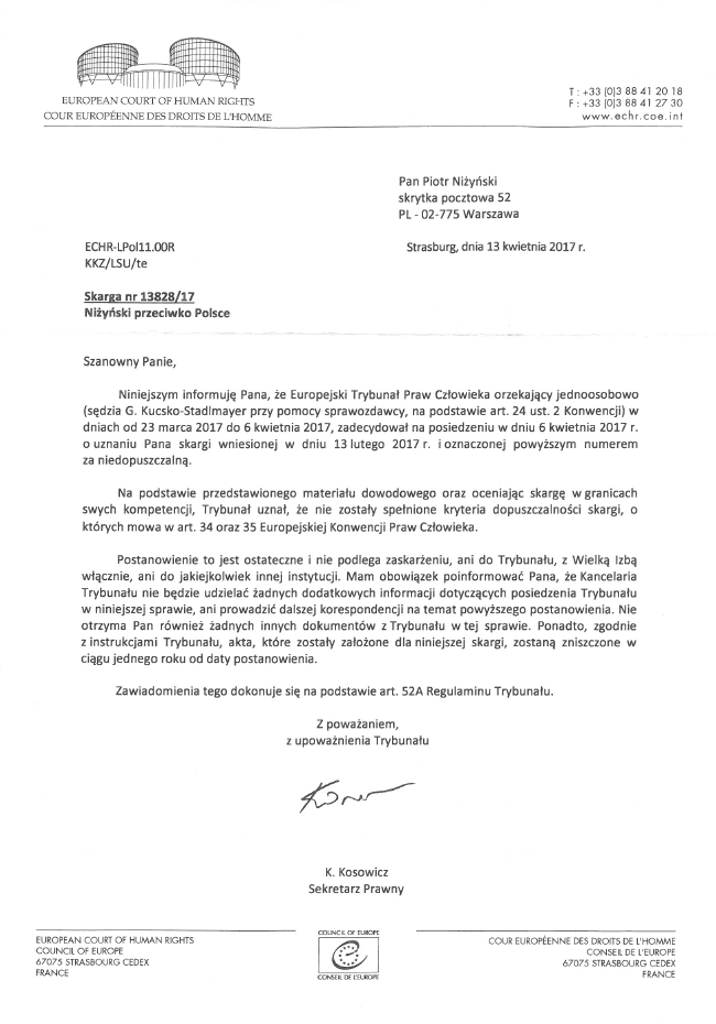 edit 2017-05-11: OTO ODPOWIEDŹ, JAKA ZGODNIE Z PRZEWIDYWANIAMI PRZYSZŁA Z TRYBUNAŁU PRAW CZŁOWIEKA: sprawy nie przyjęto nawet do rozpoznania, nie sprawdzano akt, przyjęto brak naruszeń. A szkoda, dużo pieniędzy straciłem na tej złej woli sądu polskiego i ETPCz. Trybunał lubi moje skargi odrzucać w przedbiegach, bez wnikania w meritum — wtedy odpowiedzialność jest jednostkowa, podczas gdy w razie rozprawy orzekają aż trzej sędziowie, no i jest teoretyczna możliwość odwołania się (poza tym zawraca się głowę polskiemu rządowi, zmusza go do przedstawiania tłumaczeń, co ma zawsze jakiś oddźwięk propagandowy — pewnie o to chodzi panu, nomen omen, Raj-mondiemu, głosicielowi, że w sprawie Niżyńskiego jest "tak wspaniale"... poza tym pewnie to jakaś korupcja, pewnie nawet w TVP Warszawa — po łapówce dla prezesa i dla specjalnie wyszukanego sędziego?).