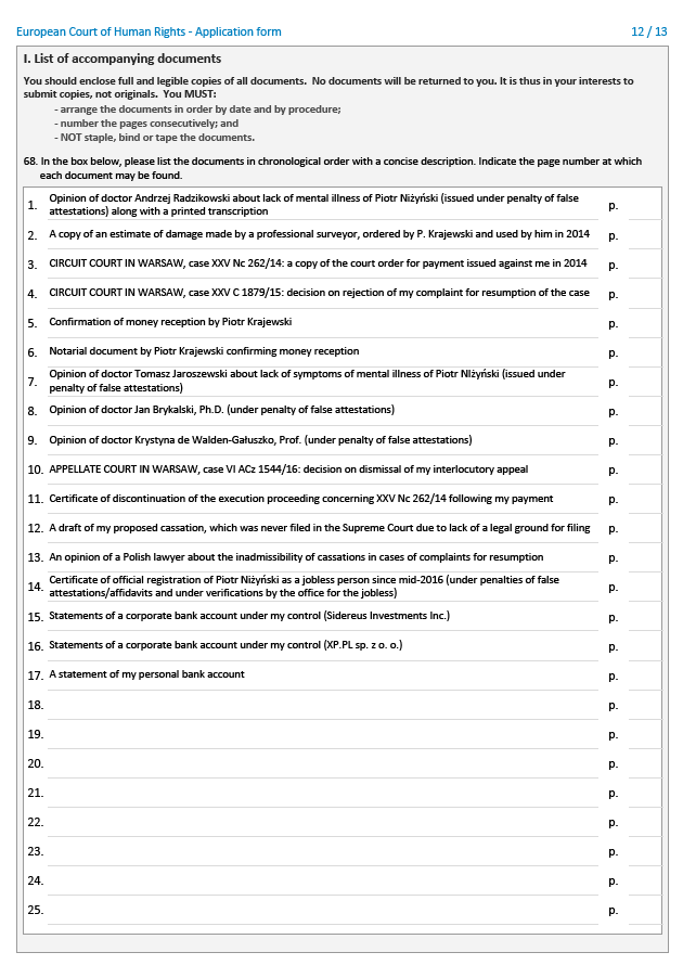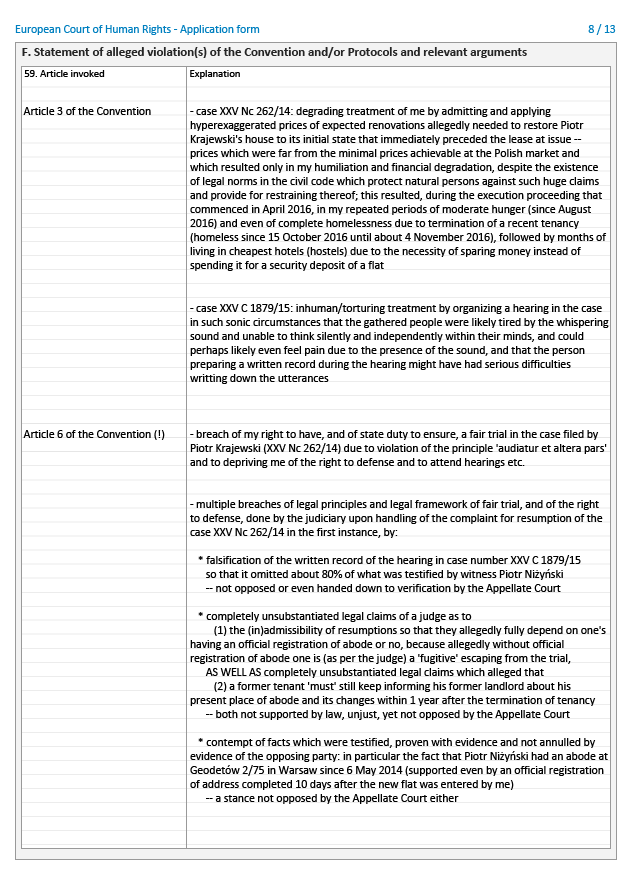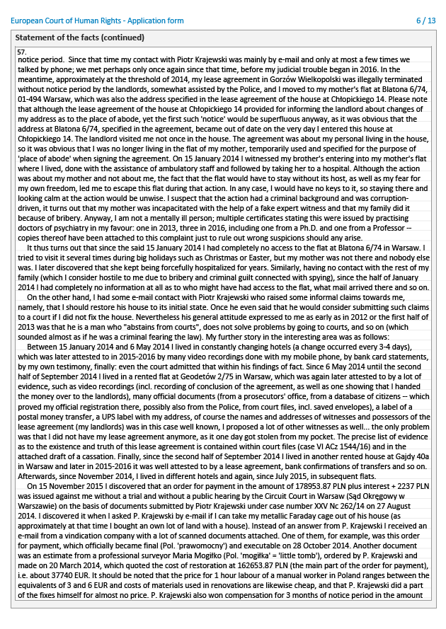 Oto treść skargi Piotra Niżyńskiego do Europejskiego Trybunału Praw Człowieka w sprawie pozwania go pod fałszywym adresem i uzyskania gigantycznego nakazu zapłaty przeciwko niemu (bez rozpraw, na samych dokumentach) przez Piotra Krajewskiego i Donatę Wójcik, a następnie odrzucenia przez sądy obu instancji skargi o wznowienie tej sprawy. Jeżeli obrazki nie załadowały się w pełni, proszę odświeżyć stronę.