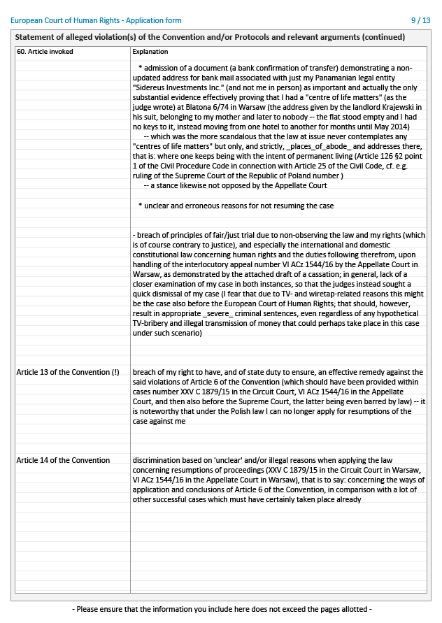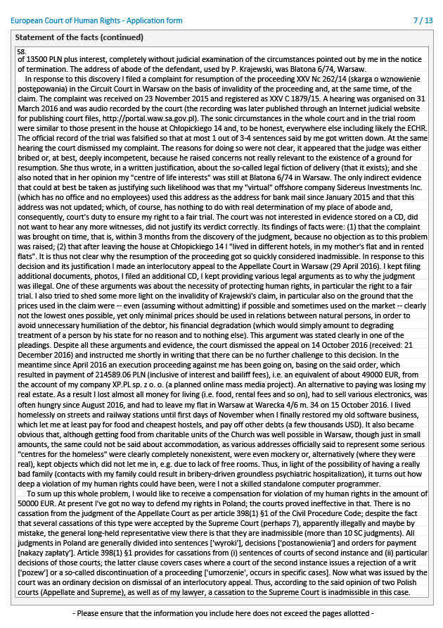 Jest oczywiste, że z jednej strony w Trybunale, jak najbardziej, takimi rzeczami się zajmują, czyli nie ma co mnie dyskryminować, a z drugiej, że Trybunał nie może ocenić zasadności podnoszonych zarzutów bez uzyskania kopii polskich akt sądowych. Tym niemniej w moim przypadku, z przyczyn kadrowych, "przegrana w przedbiegach" i tak jest nie tylko możliwa, ale nawet najbardziej prawdopodobna.
