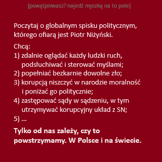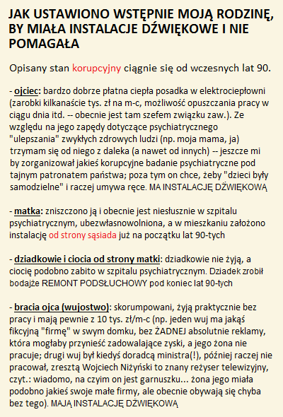 Papież inicjatorem remontu świata pod przekaz podprogowy? | Prokuratura sama przyznaje przez kilkanaście minut, że też jest zamieszana w przestępstwa podsłuchowe przeciwko Niżyńskiemu. "Można zrobić ci dobrze" (cóż za język), "Możesz sobie artykuł z tego napisać". Prawda o "tajemnicach"... | Walczmy z pomocnictwem! Dobry obywatel nawet nie wierzy w taką "tajność" (art. 82 Konstytucji). | Jan Paweł II: tajemnica w sprawie telewizji powinna być i jest obecnie sprzeczna z konstytucją polską. Jak myślicie, słuchają go w tym?... | TELEWIZJA TO ORGANIZATORZY TORTURY, A NIE RZETELNI INFORMATORZY. ZAPAMIĘTAJMY: DOTYCZY LICZNYCH DZIENNIKARZY. Czas na akcję "wytłumacz babci, dlaczego nie głosować na PiS". | Siatka związana z TVP: pokoje dla agenta (od "monitoringu"), instalacje dźwiękowe-podprogowe. | o sprawie w TVP najłatwiej dowiedzieć się u pośrednika nieruchomości lub w administracji bloku (zgłaszamy się jako zainteresowani wynajęciem "swojego" mieszkania – w administracji typowo od tego stanie temat podsłuchu na Piotra Niżyńskiego: chcą zapewnić podgląd ekranu już od pierwszych chwil, czyli potrzebne jest informowanie Facebooka o sytuacji / kontakt telefoniczny, jeśli by Niżyński się właśnie wprowadzał, bo oni mają sprzęt do szpiegowania a Facebook szpiegów-pomocników, no a poza tym remonty były i to też jest wymagane). | TELEWIZJA PRZYZNAJE MI SIĘ DO NOTORYCZNEGO WCHODZENIA W UKŁADY Z SĘDZIAMI/PREZESAMI SĄDÓW (A NAWET OKAZUJE NA TO DOWODY) WE WSZYSTKICH POSZCZEGÓLNYCH SPRAWACH. Padało też nieraz o przyjmowaniu korzyści majątkowych. To wszystko przejaw polityki "pożyteczni bandyci na wszystkich stołkach". Podstawowym źródłem problemu jest bandycki układ, w jaki liczni sędziowie podobno weszli z rządem, aby zagarniać sobie podatek zamiast go płacić. Dla wielu w pracy w mych sprawach nie liczy się nic, tylko kasa (własne 4 litery, jak najbezpieczniejsze i najbogatsze). Poprzez szantaż podatkowy korumpuje się także doraźnie wszelkiego rodzaju przedsiębiorców, w tym prawników: by świadczyli usługi niskiej jakości lub następował zupełny brak kontaktu (choć to może dla nich normalne, gdy widzą personalia Piotr Niżyński) — rzecz powszechna; by źle doradzali, tj. idąc mniej korzystnym lub wręcz nielegalnym tropem, także by zachowywali się w specjalny sposób (niekontaktowość, nieobecność w trakcie trwania umowy lub w ogóle nieprzyjmowanie zlecenia, występują też nienaturalne efekty mafijne w rodzaju specyficznych, wcale nie tak typowych sposobów okazywania, że się śledzi, nawet u prawników zagranicznych), brali w obronę wyraźnie skorumpowany sąd (postrzeganie sprawy jako przegranej lub poważnie zagrożonej z mojej rzekomo winy, bez podstawy prawnej a nawet wbrew prawu) itp.