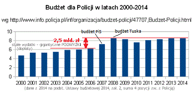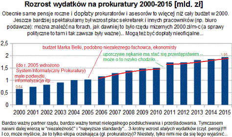 [edit 2015-02-06 01:01] Dodałem wykres (na podst. ustaw budżetowych), więc jeszcze uwaga. Prokuratorów i asesorów, czyli trzonu orzekającego, jest 6222 wg Sedlak&Sedlak; razem z innymi pracownikami będzie tego może nawet z 10 tys. (policz, ile przypada stałych wydatków, czy ich wzrostu, na głowę: to jest największy stały wydatek, pozostałe, np. korespondencja czy zwłaszcza prąd, są dużo niższe). Na prokuraturę przeciętny dorosły Polak (takich jest 30 mln.) płaci 67 zł w ciągu roku (pensja, VAT itd.); w 2000 r. to były 22 zł. Przeciętny, ale przecież tu jest też kilka mln. bezrobotnych, więc w odniesieniu do reszty to jest więcej — a jeśli zarabiasz dobrze, to płacisz jeszcze więcej... (To swoją drogą, bo w ogóle cała ta podwyżka VAT celem finansowania korupcji kosztuje przeciętnego Polaka, wydającego np. 3000 zł na miesiąc, 30 zł. Czyli co miesiąc 30 zł na tortury dla mnie.)