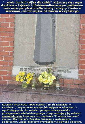 Przy tej okazji chętnie zwracam uwagę na jeszcze jeden aspekt tego całego starożytnego planu względem mnie. Przepowiednie królowej Saby zawierają też wskazówkę co do przyszłego losu tych, co za pieniądze zapisują się do antyludzkiej mafii zorganizowanej przeciwko mnie, zwalczającej mą wolność myślenia, a wspierającej "telewizyjnych" sadystów. Mianowicie: to, że "z jednej pracy będą robić 2 prace" (s. 20 tekstu) jest tam zapowiedzią nadchodzącego sądu ostatecznego (czasy apokaliptyczne). Chodzi tu o przestępstwa podsłuchowe, w które wciąga się na rynku pracy przy okazji dodatkowej pracy przy monitoringu budynku. Od siebie dodam, że gołym okiem widoczną niesprawiedliwością byłoby masowe uniewinnianie takich ludzi albo nawet karanie ich tylko grzywną, podczas gdy jest to właśnie to, co z natury rzeczy uwzględniają oni w swych kalkulacjach jako jedyną ewentualnie w grę wchodzącą opcję (i z natury rzeczy, jak to w takiej sytuacji być musi, przekonani są oni, że jest ona bardzo nieprawdopodobna – "przecież wszyscy są przeciwko temu kolesiowi, cały system"). Abstrahuję tu już nawet od 50-letniej tradycji głoszącej u nas, że za udział w gangu kara się nie grzywną, nie karą w zawieszeniu, tylko po prostu więzieniem – a przeciez udział w gangu wspólnym z państwem, w mafii politycznej, jest społecznie wyraźnie bardziej szkodliwy niż udział w grupie oddolnie tworzonej. Załóżmy tu nawet, że jesteśmy wykorzenieni z tej tradycji (podważanej od czasów ministra Borysa Budki z PO); nie tylko w tym rzecz. Widmo "prawie na pewno jedynie co najwyżej, w ostatecznym rozrachunku, niepowodzenia finansowego", czyli przegrania sprawy majątkowej, jak widać nie odstrasza wystarczająco, nie spełnia tego podstawowego celu kary, jakim jest prewencja ogólna. Jeśli by tak miał wyglądać "ostateczny sąd" w demokratycznym, skorym do intelektualnie wartościowego dialogu państwie, świadczyłoby to tylko o tym, że niewłaściwe osoby – to znaczy: osoby uwikłane, np. rodzinnie, a za to nie mające argumentów merytorycznych lub przygotowania naukowo-doktrynalnego – pchają się do sądzenia i zajmują stanowiska sędziowskie.