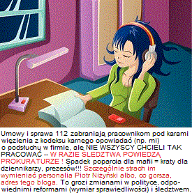 Zmuszają Cię gdzieś do bycia bandytą – nielegalnym agentem podsłuchowym w ich gangu? Nagraj i donieś na blog! Albo chociaż zagroź, że rozpowiesz, np. w portalu xp.pl. (W gastronomii bywa, że grożą późniejszym zwolnieniem w razie pracy bez przestępstw.) Zgodnie z Prawem prasowym nikogo nie mogą spotkać żadne nieprzyjemności za informowanie prasy o swojej wersji zdarzeń. Obecnie dochodzi do tego jeszcze ustawa o sygnalistach, wdrażająca prawo europejskie. |