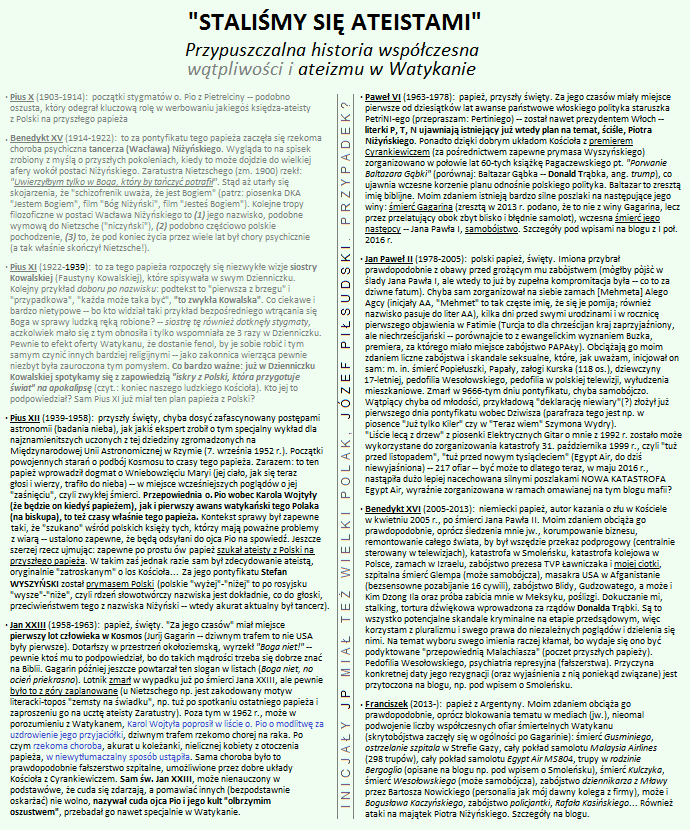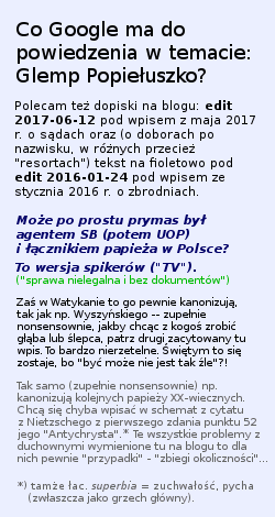 edit 2021-08-11: PS2 Dziś spikerzy przyznali, jak odbywają się ataki na mnie (w tym np. pomówienia policyjne kojarzące się też z ministrem Brudzińskim, ataki karnosarbowe, haniebne orzeczenia sądów, ataki w toaletach, pogróżki, blokowanie drogi przez osobnika rzucającego się na mnie raz za razem z pięściami – może to też nawiązanie do braciszka, bo też była taka sprawa – itd.). – [rozwiń dopisek...]Nawiązali mi przy tym do mych doświadczeń z początków tortury dźwiękowej, z 2013 r., kiedy to była ona bardzo miarowa i nieemocjonalna, i składają się tylko i wyłącznie z szeptów, z małą jedynie domieszą wołań, przy czym w kółko powtarzano te same kilka słów (na zmianę, raz te kwestie, raz tamte, z pewnym sensem dostosowanym do sytuacji, ale jednak w kółko utarte slogany), np. "bardzo mi wstyd", "myślę, że tak; myślę, że nie" (jedna kwestia jednym ciągiem mówiona; typowo – na temat wyniku sprawy w sądzie, np. o wszczęcie śledztwa), "tutaj jest sprawa". Te wypowiedzi spikerków były zapewne relacjonowaniem tego, co do nich dociera, jak wygląda ich komunikacja z innymi. Wychodzi na to, że z wyjątkiem kwestii sądowych czysto technicznych, takich, jak łapówkarstwo (jako że sędziowie pewnie niechętnie się poświęcają, by być tym, kto uwali sprawę, więc zgłaszają się ci, co chcą łapówkę – już nieraz mi to przyznawano), jak również kwestii podsłuchowych związanych z obsługą radaru (tylko w tym zakresie stosowana jest widocznie komunikacja przez Gadu-Gadu), po prostu mają kontakt być może z samym papieżem (np. przez szyfrowaną komunikację tekstową w smartfonach a la SMS-y, tzw. WhatsApp, czego żaden centralny operator nie jest w stanie podglądać), który im opowiada, co zrobił. A zatem to on "myśli, że sprawa zakończy się tak-a-tak". Przykładem tego np. beatyfikacja (ale nie kanonizacja, czyli niejako stopień pośredni) Piotra Skargi ogłoszona jako plan działań akurat wtedy, gdy w 2016 r. trafiła do sądu moja skarga na komornika, po czym skargę tę uwzględniono w połowie (choć w pełni słuszna, co udowodniłem orzecznictwem Sądu Najwyższego, była co do obu swych zarzutów; również mówiono mi wtedy, że opłata "nie będzie najmniejsza", czyli taka, jaka by była przy uwzględnieniu obu zarzutów, a także podstawiono mi na mieście kogoś, kto nawiązując widocznie do tej sprawy opłaty komorniczej był jakimś karłem, przy czym wyświetlanie się jakichś ludzi, haseł itd., np. nagłaśnianie ich na bilbordach, kojarzy się z tezą, że "tego raczej nie będzie", "wymaga[łoby] sporej reklamy"). Oczywiście rzecz jest tak dobrana, że przychylny Watykanowi wazeliniarz powiedziałby, że to zamiana przyczyny i skutku: że ktoś się podszył pod temat oficjalny Watykanu (który wprawdzie by się prawie na pewno, tzn. najprawdopodobniej, przecież nie zdarzył akurat w tym momencie, ale nie wymagajmy wielkiego intelektu od obrońców obecnego papiestwa – "niech będzie, że był właśnie akurat taki skrajnie nieprawdopodobny przypadek" ich na pewno satysfakcjonuje). Otóż ponoć spikerzy sami z siebie prawie nic nie mogą. Komunikują się, obsługują podsłuch, nawet więcej niż 1 podsłuch, bo mogą też załatwiać przy okazji jakąś inną osobę, badać jej temat, by w końcu wysłać ją do szpitala wmawiając atak serca czy prowokując hiperwentylację i problemy. Sami jednak politycznie nic nie wskórają. Natomiast mają kontakt, załóżmy, z głową obcego państwa, ta zaś z kolei ma pod telefonem prawicowego premiera. Dawniej był Tusk, teraz np. Morawiecki, a nawet i za Millera pewnie tak było, w każdym razie jest tradycja, że premier to z papieżem się trochę kolegują przez telefon. I premier załatwia dla papieża różne sprawy, bo sam ma praktycznie na lewo (z nielegalnych powodów) telefony do wszystkich ważnych, albo sam bezpośrednio, albo przez swych kolegów z rządu. Spikerzy zaś sami z siebie podobno od załatwiania niczego ważnego, np. przez Gadu-Gadu czy maile, generalnie nie są – to nie te metody, nie to źródło wpływów. Przykłady efektów tego załatwiania spraw lewymi metodami przez premiera są może np. w artykułach xp.pl (pierwszy, drugi), jak Państwo uważacie?... Trzeba by popokazywać i zrobić ankietę, co ludzie na to. Demokracja niech panuje. Najlepsze jest jednak to, co to implikuje. Premier ma pod telefonem swoich kolesiów wszędzie. Prezesa Poczty Polskiej, prezesów galerii handlowych (zamykają toalety publiczne czasem mi na złość, czasem nawet w kilku wypróbowanych miejscach pod rząd, mogą też zdarzyć sie inne problemy), prezesów banków, w tym prywatnych, prezes ZUS-u (Gertruda Uścińska, przy czym jej nazwisko to dwuznacznik: sugeruje w rynsztokowym języku to wyrażając po pierwsze, że "robi lachę", tj. wysługuje się polityce, a po drugie, że "jak się nie podoba, to jest i druga opcja: WYCHODZI" – gdyż "uscito" to po włosku bodajże "wyjście"), mój doradca z PKO BP (też jakieś nazwisko Uścińska; oddział dosyć centralnie rozlokowany w Warszawie), prezesów pewnie także mediów, nie mówiąc już o ministrach, bo od tych kolejne jeszcze rzeczy zależą, np. prokuratura, Policja, najeżdżające mnie różne firmy (też to pewnie jacyś krewni i znajomi królika), np. firmy taksówkowe, Solid Security, instytucje miejskie (kontrolerzy biletów, jakieś pojazdy "wodociągi", "zarząd transportu miejskiego" itp. – one wszystkie mogą mnie ponajeżdżać, gdy to akurat komuś wyda się sensowne, niosące jakieś kontekstowe znaczenie) itd. Jest to wielki skandal, że ci wszyscy kierownicy i podlegli im ludzie to chłopacy na posyłki premiera, zabawki, którymi się dyryguje, oczywiście nie za darmo, bo jest współpraca podatkowa, prezes często z nadania państwowego też zgarnia sporo pieniędzy itd. Tym niemniej jest to wykorzystywane przede wszystkim do codziennego 