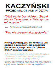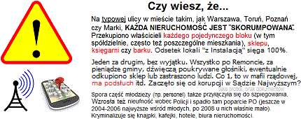 Dobrze, a teraz jeszcze raz do głupców, o których pisałem w nagłówku tego bloga [edit 2015-05-09: wtedy było tam "Przeciwko głupim, którzy prawdy o Polsce i polityce szukają w telewizji" w miejsce dzisiejszego "NIE UFASZ? REKLAMUJ I TAK" itd.]. Tak, to jest bardzo ważny temat. Premier, przestępstwa, masy, żałosny stan moralności i praworządności w kraju. Tak, media o tym nie mówią: nie od dzisiaj, gdy zobaczyłeś tego bloga, nie "sprawa jest w toku", również nie od wczoraj, tylko ja zdycham od 4 lat, a oni o tym nie mówią. Nie pomagają jedne po drugiej próby kontaktu. Dzieją się najdziwniejsze rzeczy, obecnie od 2 lat torturowane są całe osiedla, ja non stop — niewarte wzmianki... Jasne? OK, więc, żeby nie było, że się na siebie gniewamy, że kogoś obrażam itd. Dobrze, nie ma w mediach "omerty". To jedne z nielicznych firm na chodzie i z własnymi lokalami, gdzie tortury się nie włącza i w ogóle nawet nie jest "zamontowana" (ukryta) w ścianach budynku (zob. np. wpisy Praktyka organizowania..., Kolejne taśmy, Szczegóły instalacji dźwiękowej). Ci jedni, ten "ostatni" bastion: media — nie oszczędzają na podatkach... Tylko ich ludzie ciągle robią nagłówki kojarzące się z moim tematem, w pracy, a nigdy nie powiedzą wprost, że jest taki człowiek i że ma problem, i że miewają go też całe osiedla. Strasznie skomplikowane o tym wspomnieć. Mówią o zorzach polarnych, o ciekawych zjawiskach, zaćmieniach księżyca czy problemach w Afryce, ale o Polaku ciężej niż za komuny prześladowanym politycznie — nie.