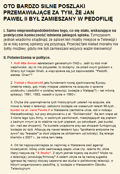[teza TVP (?); wg mnie bardzo prawdopodobne]. — TEN PODSŁUCH ITD. WSPÓŁORGANIZOWAŁ CHYBA JAN PAWEŁ II (skandal). — Nagonka; sadyzm kwitnie, zwłaszcza na Wiejskiej (jest przestępcze śledzenie). Bardzo ważna WWW! Od ponad 30 lat każdy dom jest dla władz przezroczysty i słyszalny, zobacz, jak! TA STRONA NADAJE SIĘ DO TEGO, BY JĄ WERTOWAĆ ZAMIAST OGLĄDANIA WIADOMOŚCI. BARDZO WAŻNE TEMATY, O KTÓRYCH NIE MOŻNA POCZYTAĆ NIGDZIE INDZIEJ. I nie jestem gołosłowny. Wszystko jest tu dalej udowodnione.