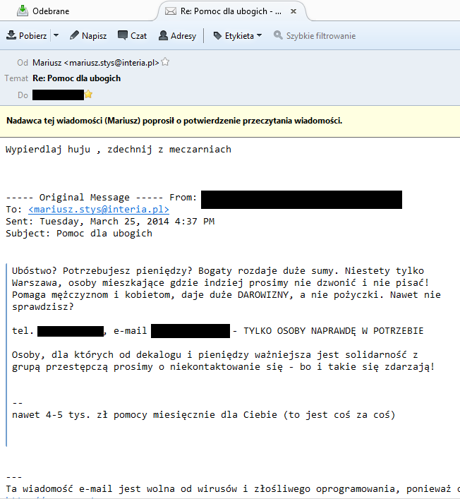 Oczywiście, nie marnując czasu na większe starania, przychodzenie do biur itd. (boję się, że nie ma ani jednego porządnego wśród odbierających skrzynkę lub nie potrafią jeden drugiemu przekazać!), wysłałem krótkie powiadomienie o tych nowych wideo do wszystkich posłów (adresy z odnośnika na samym dole bloga). I pewnie nic [edit 2015-05-09: tak, 0 odpowiedzi, od niektórych przychodzi zwrotnie automatyczne powiadomienie "Przeczytano" — a przecież treści tego bloga są przerażające i każdy normalny polityk by się zainteresował, by następnie zmiażdżyć tym przeciwnika] — nie wiem, może odpowiada im ten stan rzeczy (to całkiem prawdopodobne).