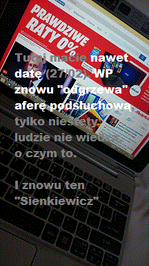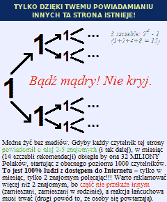 [edit 2015-01-24 21:44] Wrzuciłem też kolejne świeże prezentacje znajomości przez media mojego problemu (i lekceważenia go, bo tak jest już od dawna). Zobacz stronę foto/wideo. Tutaj piękne zdjęcie strony Onet.pl, a jest też film z korzystaniem z Internetu, gdzie widać daty, komputer, jego podłączenie do sieci itd. (nawet miejsce nakręcenia). Uczciwy powiedziałby "macie w d***e Polskę i drugiego człowieka!", ale za to dzisiaj można oberwać (złe sądy)... [edit 2015-01-25] Aha, na wypadek, gdybyś kiedyś chciał własne media otwierać, pamiętaj tylko o jednym: NIE WOLNO ludziom zabraniać mówić o temacie(!!!) czy nawet sugerować, proponować, zachęcać do pomijania go. Nawet tymczasowo, "na razie nie, bo za dobry, a nas Teleexpressy olewają, więc jak tu z motyką na słońce", "na razie nie, bo nie ma dowodów/nie uwierzą nam". Wszelkie takie działania będą mogły być zaklasyfikowane jako pomocnictwo w, trwającym wciąż przecież, przestępstwie. (Na tej to właśnie podstawie wszyscy obecni magnaci medialni boją się kary 25 lat więzienia.) Następnie zniechęcony tym, żeś też stał się przestępcą, choćby nawet drobnym i trochę niechcący, łatwiej pewnie ulegniesz, wpadniesz w sidła korupcji, bo państwo ma ogromne możliwości finansowe (choć, w porównaniu z tym, i tak to sektor prywatny jest kołem zamachowym gospodarki i gromadzi wielokrotnie więcej PKB). Przez taki nawet głupi błąd (może podyktowany nawykami wyniesionymi z mediów, jakimś irracjonalnym płynącym z przyzwyczajenia skrępowaniem przy wchodzeniu na ten temat, który ci kontakt z bandziorami zaszczepił) mogą upaść twe ambitne plany!