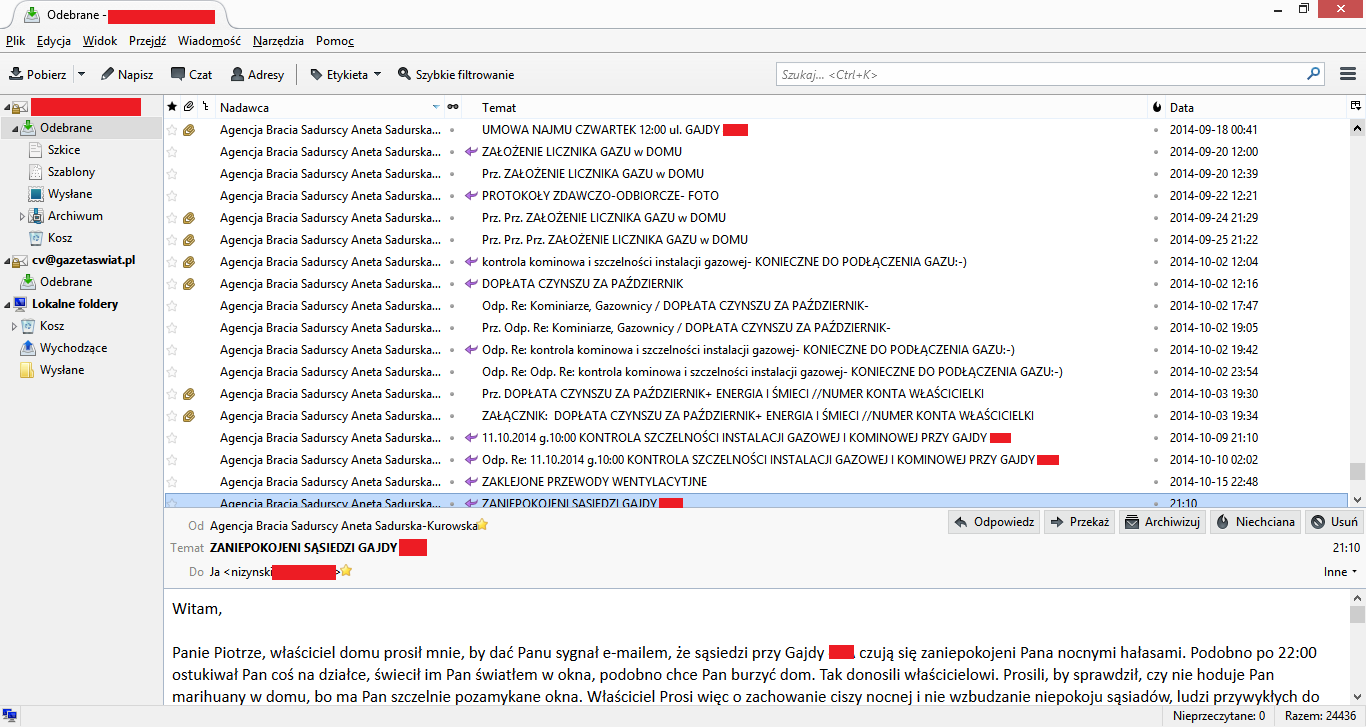 [zautomatyzowanych telefonów grających] na 112 i w lokalne bazy, umacnianej u mnie przez nieco zwodnicze teksty rozmówców i spikerów. W rzeczywistości obecnie w hotelach, a może i dawniej tak było, być może pracownicy nawet nie śledzą mnie zmianowo w pracy. Główne przestępstwo, które tam trzeba zrobić, to włączenie śledzenia ekranu komputera na zasadzie odbioru fal, odpowiedni przydział pokoi pod to — to 24-godzinne czyhanie mogą robić nawet recepcjonistki własnoręcznie, ewentualnie ochroniarze, kierowniczki, sprzątaczki itp. Nad moim ekranem, bo o to chodzi, trzeba też, włączywszy już odpowiedni program, na bieżąco pracować (wykonywać bezinwazyjnie "zdjęcia" ekranu w pokoju obok, rozgłaszać je w Internecie innym członkom tej mafii). To wszystko robi albo jakaś przychodząca może niewystrojona służbowo obsługa, albo nasłane przez TV(?) (w opisach sytuacji, czyli tekstach ogłaszanych chyba wraz z ekranem w Internecie — strony www do dziś nikt mi z tych setek tysięcy nie pokazał) tłumy młodzieży, która zrobi to dla hotelu czy, w bloku, dla sąsiada za pieniądze (oczywiście ONI za pobyt w takim miejscu nawet nie płacą — przeciwnie, dostają; pamiętam nawet dziewkę, którą zatkało na recepcji hostelu w 2011, i wyrzekła tylko moją przybraną ksywkę i "przypał!", albo teraz 2015-01-05 z B&B, która chowała sobie terminal płatniczy przychodząc, wśród udawanych normalnych kurtuazji; przykłady typowych gości hotelowych). To są zapewne bardzo ciekawe sceny, te przyjścia i rozmowy nieznających się ludzi. "U was podobno jest teraz Piotrek?" itp.: aż się prosi, żeby to ktoś nagrał, no ale cóż, ci, co przychodzą, zwykle też są zamieszani, więc daremne marzenia.] Gumtree.pl czepiał się mnie,