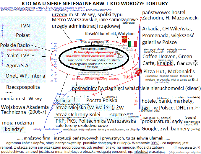 Kto tym wszystkim steruje? Jeśli chodzi o TVP, to są poszlaki (oraz tak się przyznawano), że szef Kancelarii Prezesa Rady Ministrów [edit: to pewnie dlatego uparcie, po prostu w jakimś skrajnym-radykalnym uporze nie chcieli jak dotąd śledztwa nawet przeciwko samej tylko TVP skierowanego, bo przecież dałoby się do tego sprawę ograniczyć: bo np. "wyciekłaby korespondencja Dworczyka" czy raczej oficjalnego profilu Kancelarii Premiera hipotetycznie o zabijaniu w Legionowie, podobnie jak korespondencja Arabskiego czy raczej ww. profilu hipotetycznie o zamachu w Smoleńsku (był na pewno) i torturowaniu mnie: Facebook takie wiadomości trzyma w nieskończoność – może to przez to ta "bliźniacza afera" z Dworczykiem], zaś sam premier podlega pod zleceniodawcę politycznego w postaci np. prezydenta USA (raczej nigdy nie bezpośrednio pod papieża, jeśli chodzi o podżeganie do konkretnych przestępstw).