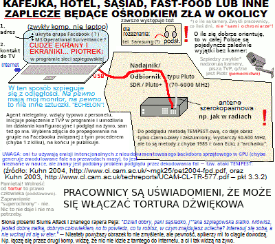 [edit 2015-03-07] Zauważmy, mowa w tym wpisie o zupełnie odrębnej kryminalizacji niż ta związana ze szpiegowaniem (i podsłuchiwaniem) zmianowym przez pracowników... [rozwiń dopisek], w celu przechwytywania z odległości ekranu mojego laptopa czy nawet komputera biurkowego (co generalnie szybko przejmuje sąsiad blokowy czy domkowy, jeśli się gdzieś wprowadzam na dłużej). Tę drugą kryminalizację praktykuje się, jako inna sprawa ze mną związana, w licznych placówkach, zwłaszcza znanych sieci gastronomicznych; łatwo to poznać po "agenturalności" personelu, ich dziwnych wypowiedziach, reakcjach, jakby tam ktoś na bieżąco szpiegował albo było coś dziwnego nie w porządku z firmą (na tle szpiegowskim); w tej kwestii, kogo podejrzewać (bo gdzieś generalnie to się robi), mogę się dość autorytatywnie wypowiadać jako świadek tych reakcji. Prawdopodobieństwo, że nieruchomość ma taki personel i praktykuje szpiegostwo, wzrasta z jej wielkością oraz wielkością i renomą firmy (trochę dziwne z medialnego punktu widzenia dawać specjalnie wysokie zarobki w jakichś typowych mikrofiremkach); również instytucje publiczne w to się chętnie wciąga (chyba nawet poczty), tak samo nawet stacje benzynowe (co ciekawe jeden z pracowników sugerował mi w takiej, że popiera PO). Wlicza się tu mnóstwo lokali i sieci gastronomicznych (wszystko zależnie od potrzeby, bo w pewnym promieniu dobrze działa jedno urządzenie i po co to powielać, ryzykując poparciem Platformy itp.; wielkość zapleczy musi być oczywiście odpowiednia, żeby nie ryzykować — osobne nie za małe i zapchane pomieszczenia itd.). W pewnych firmach wręcz, jak np. pewien McDonald's gorzowski (jest w foto/wideo: PLIKI-NOWE), widziałem o specyficznej porze (np. po 12-ej) zmiany w pokoiku dla obsługi, co należy dodać do niedwuznacznych sugestii obsługi czy kierowników w innych obiektach tej sieci. Kliknij (jeszcze czym innym, najbardziej powszechnym, jest po prostu posiadanie przez młodzież pracującą w danym miejscu w prywatnym telefonie programu do szpiegowania — to chyba w 90% firm gastronomicznych rozdają, ponadto wszędzie tam, gdzie jest ww. "ABW", a młodzież często jest chętna; poza tym w szkołach i na studiach to się potrafi rozprzestrzeniać). [ukryj dopisek]